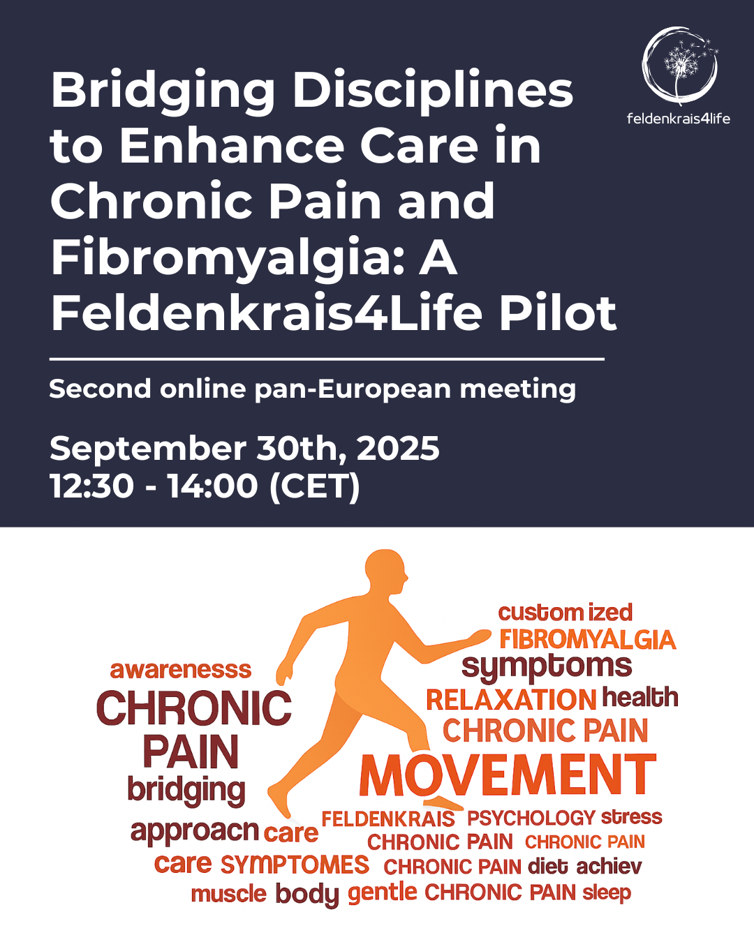 The Feldenkrais4life Project Team is delighted to invite you to the second Pan-European meeting on 30 September, 12:30 – 14:00 (CET) about bridging disciplines to enhance care in chronic pain and fibromyalgia. The event will be held in English with the option to select automatic translation via subtitles in your language.
